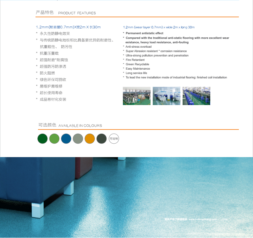 高分子防静电工业地板采用专利防静电设计表层处理*优异抗刮伤性能*同时兼备防滑性、美观性与易清洁性。*抗重压重载*超强耐磨*耐腐蚀*超强防污防渗透*防火阻燃*绿色环保可回收*易维护易维修*超长使用寿命*成品卷材化安装.它是一种采用聚氯乙烯为原材料通过高温热压成型的地板,此地板具备防油性、抗污性、抗腐蚀、防水防潮、施工工期短维修简单、耐磨性好、抗静电、重载、能过叉车、环保无毒、可回收再利用等优点!此产品的出现正好填补了市场快速发展带来的空白,各项性能指标均衡且优异,可以逐步替代原有环氧地坪及各类水泥面工业地面,应用将逐渐增大,市场前景广阔。